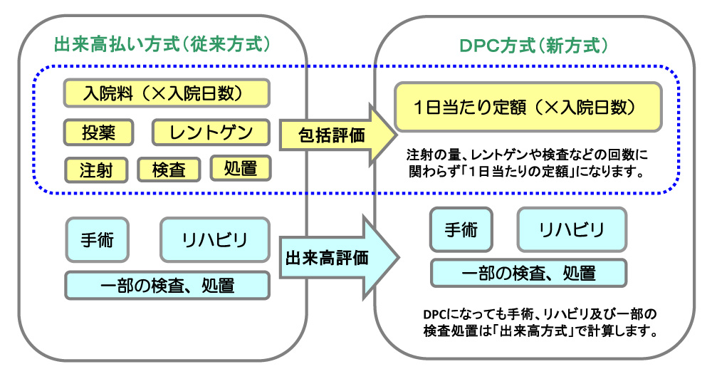A2.どちらとも言えません。DPCでは、患者さまの入院している病名によって1日当たりの医療費が決まりますので、従来の出来高払い方式と比べ高くなる場合もありますし、安くなる場合もあります。また入院日数によっても、1日当たりの医療費が変わる仕組みになっています。