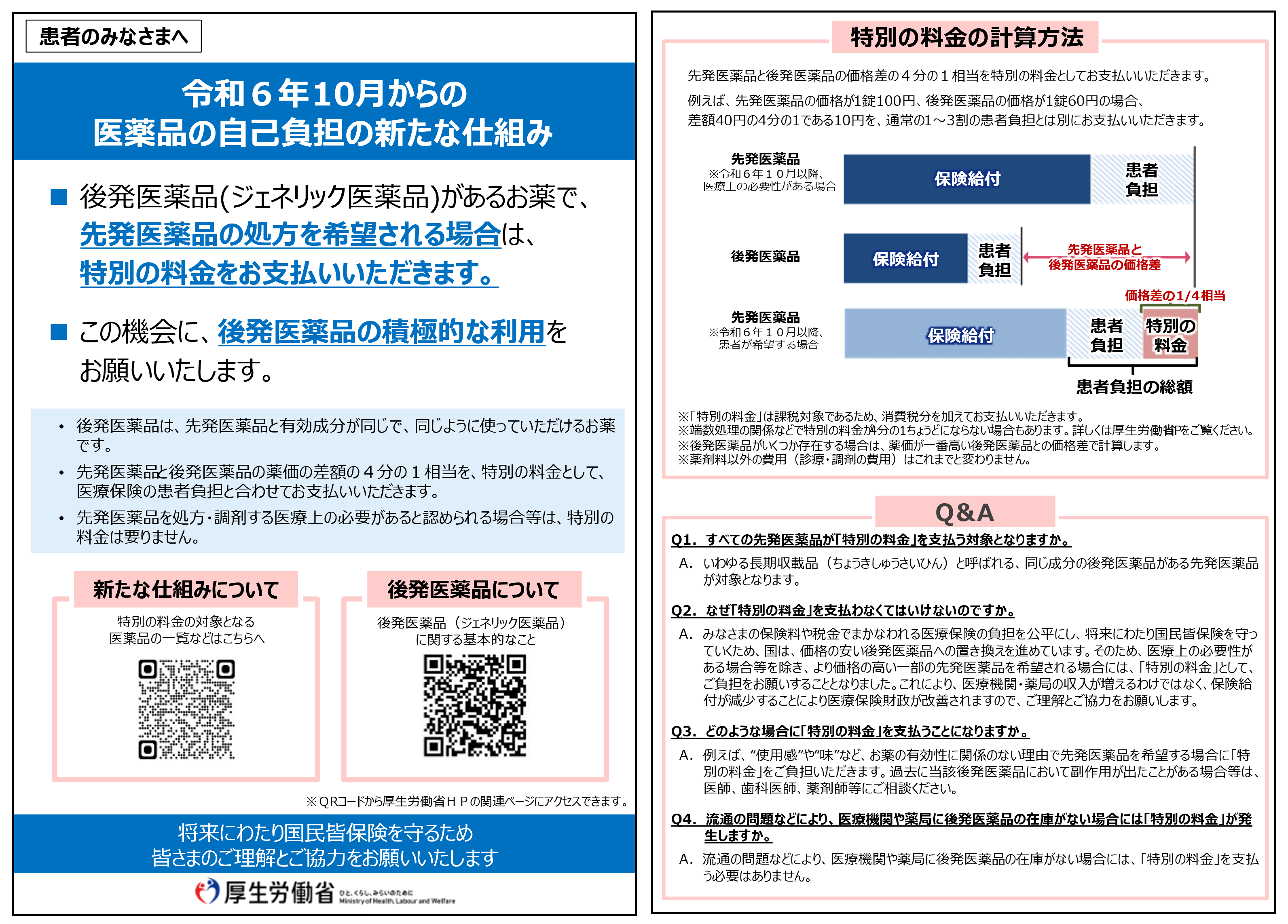 令和6年10月より長期収載品(後発医薬品のある先発品)について、医療上の必要性があると認められない場合に患者さんの希望を踏まえ処方を実施した場合は、「選定療養」の対象となり調剤薬局にて特別な料金が発生する場合があります。